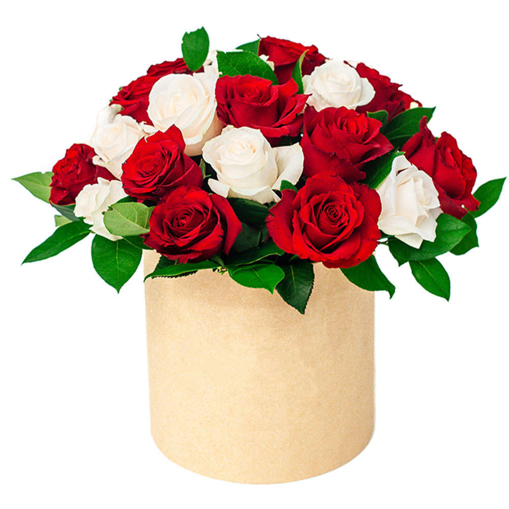Роза красная, роза белая, зелень.