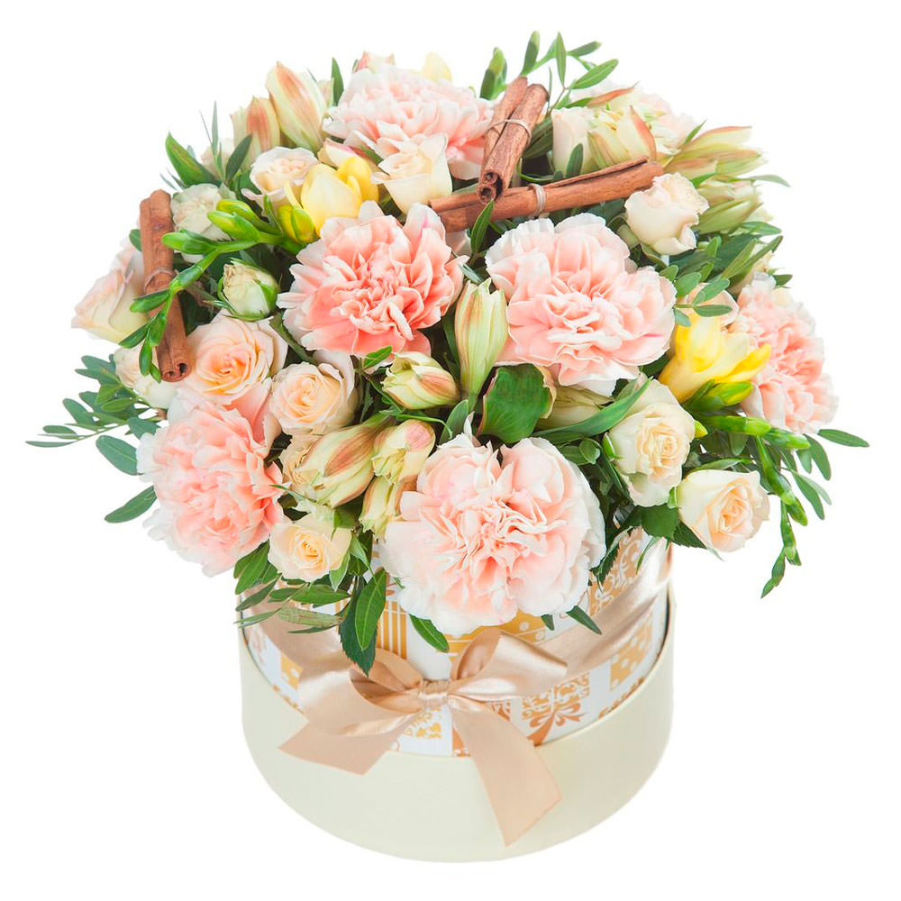 Гвоздика, альстромерия, кустовая роза, фрезия, фисташка, декоративные элементы.